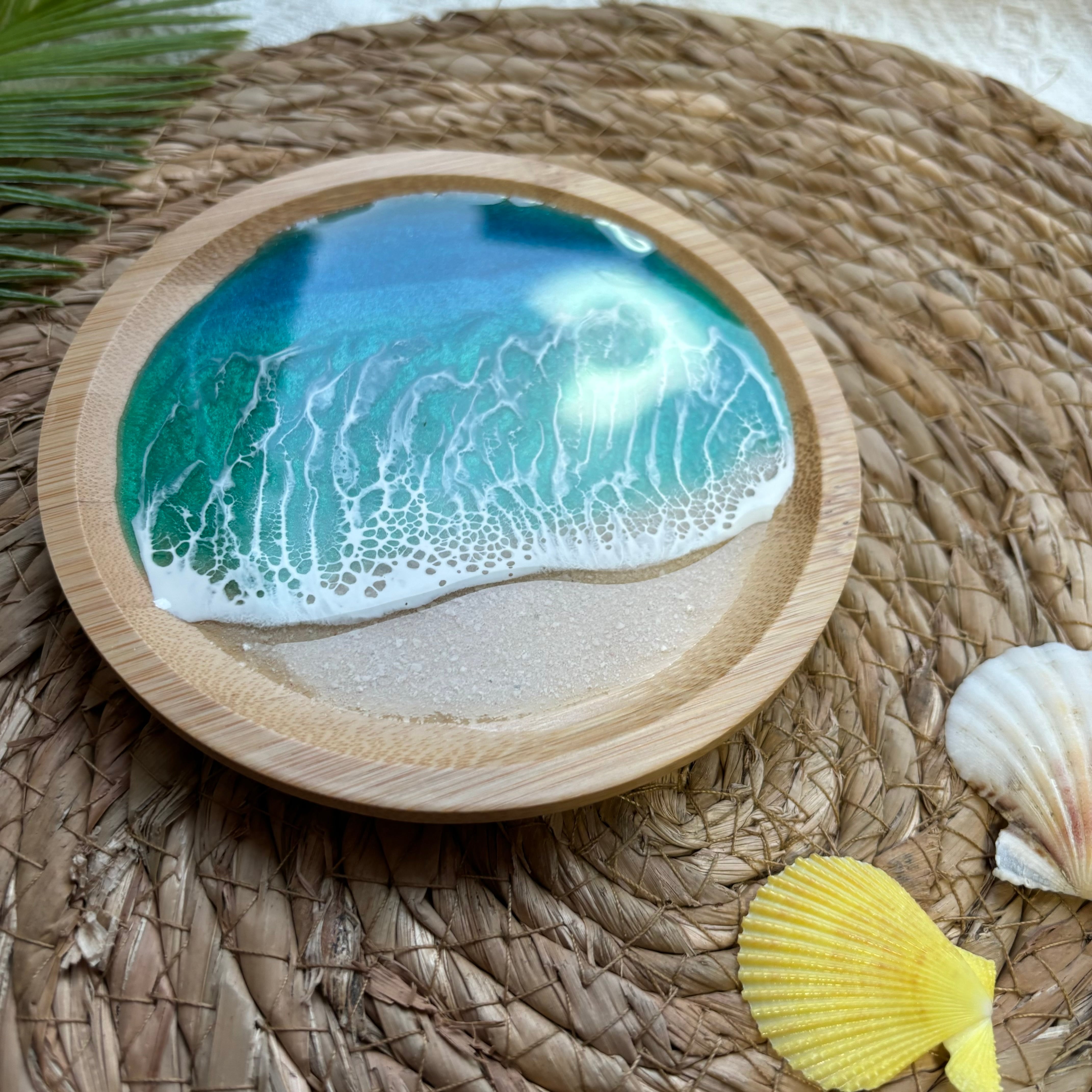 エポキシレジンを使って、直径約13cmのバンブートレイに海アートを作っています。